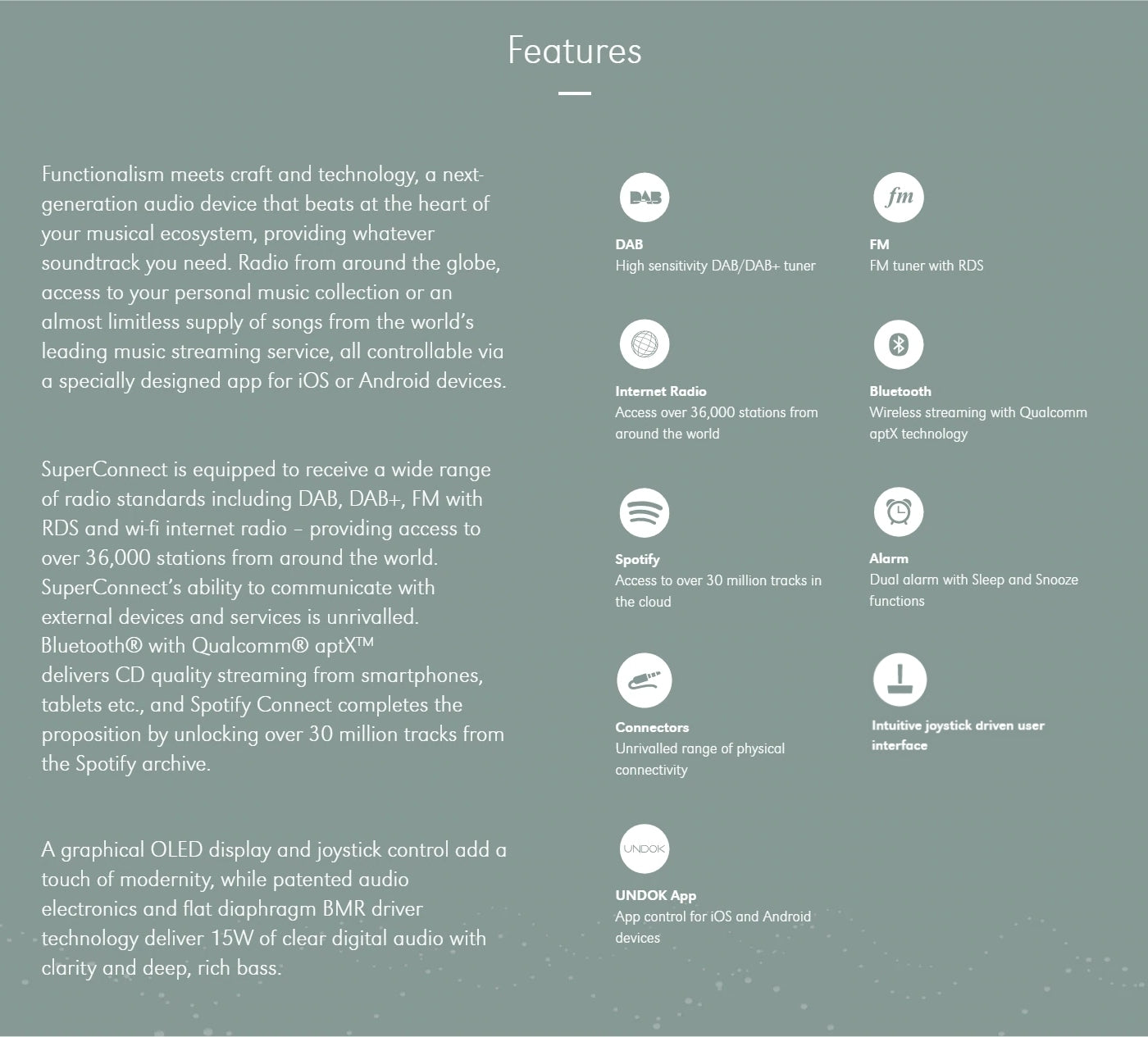The integrated Bluetooth 5.2 offers CD quality sound from smartphones, tablets etc. Spotify Connect completes the offer. Using UNDOK technology the SuperConnect can be controlled via an iOS or Android device application.