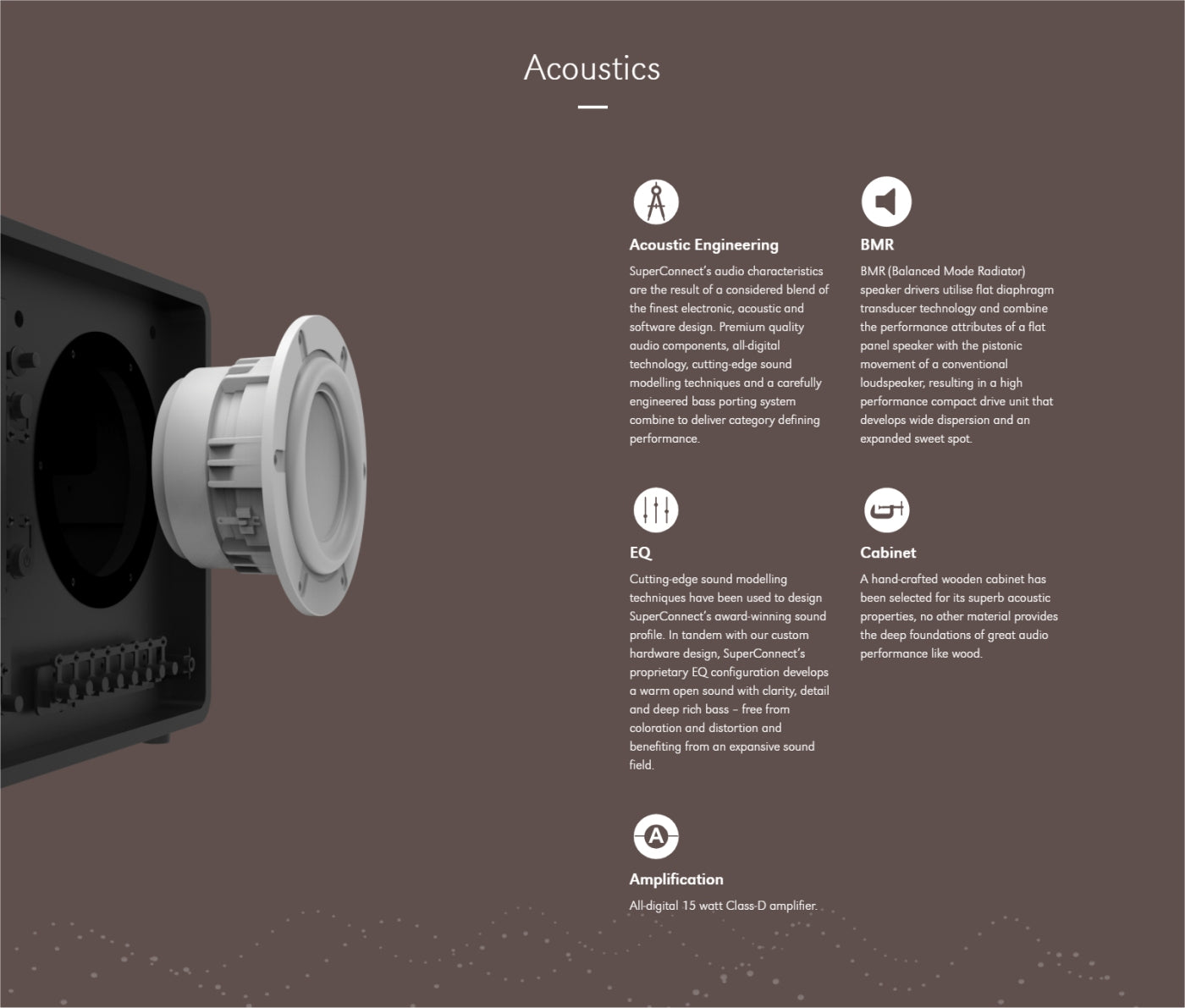 The 15W class D amplifier used and the 3.5" BMR (Balanced Mode Radiator) speaker guarantee perfect digital audio with clarity and deep and rich bass.